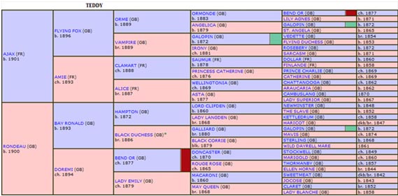 Tendo BAY RONALD como Avô Materno, TEDDY (1913 – FR) estabeleceu uma Linhagem de Referência caracterizada pela Consistência e Resistência, com Alcance Estamínico centrado nos 2 400 m, pista de grama.