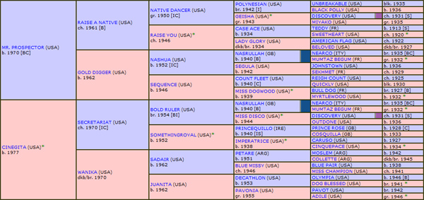 • (HL) – Mr. PROSPECTOR – NATIVE DANCER • (ML) – SECRETARIAT – PHALARIS / NASRULLAH • Alcance Estamínico: 1 600 m, pista de areia. • Configuração Genética Básica: • a – Por Linhagem de Referência: NATIVE DANCER com PHALARIS; • b – Por “Bloodline”: Mr. PROSPECTOR com NASRULLAH. • Duplicações: 5 X 5 DISCOVERY – FAIR PLAY; 4 X 4 NASRULLAH – PHALARIS. • Família Materna: 25. • Matrizes servidas em 2009: 39 • Reprodutor sediado no Haras San Francesco, São Paulo.
