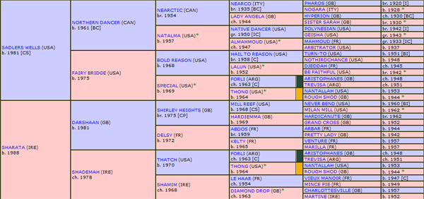• (HL) – SADLER’S WELLS – PHALARIS / NORTHERN DANCER • (ML) – DARSHAAN – PHALARIS / NASRULLAH • Alcance Estamínico: 1 600 m a 1800 m, pista de grama. • Configuração Genética Básica: • a – Por Linhagem de Referência: PHALARIS com PHALARIS; • b – Por “Bloodline”: NORTHERN DANCER com NASRULLAH. • Duplicações: 3 X 3 SPECIAL/THATCH (FORLI/THONG) – HYPERION • Família Materna: 3 – o. • Matrizes servidas em 2009: 52 • Reprodutor sediado no Haras Bagé do Sul, Bagé, Rio Grande do Sul.