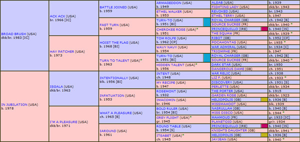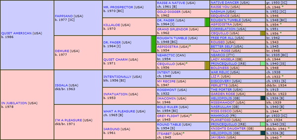 • (HL) – QUIET AMERICAN – NATIVE DANCER / Mr. PROSPECTOR • (ML) – ISGALA – MAN O’ WAR / WAR RELIC • Alcance Estamínico: 1 800 m, pista de areia. • Configuração Genética Básica: • a – Por Linhagem de Referência: NATIVE DANCER com MAN O’ WAR; b – Por “Bloodline”: Mr. PROSPECTOR com WAR RELIC. • Duplicações: 5 X 5 (XF) PRINCEQUILLO – St. SIMON. • Família Materna: 11. • Matrizes servidas em 2009: 49 • Reprodutor sediado no Stud TNT, Bagé, Rio Grande do Sul.