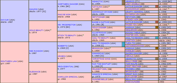 • (HL) – DAYJUR – PHALARIS / NORTHERN DANCER • (ML) – RED RANSOM – PHALARIS / ROYAL CHARGER • Alcance Estamínico: 1 600 m, pista de grama • Configuração Genética Básica: • a – Por Linhagem de Referência: PHALARIS com PHALARIS; • b – Por “Bloodline”: NORTHERN DANCER com ROYAL CHARGER. • Duplicações: 4 X 5 NEARCTIC – PHALARIS / NEARCO; 5 X 5 NASHUA – PHALARIS / NASRULLAH; 5 X 4 HAIL TO REASON – PHALARIS / ROYAL CHARGER. • Família Materna: A 1 • Matrizes servidas em 2009: 23 • Reprodutor sediado no Haras J. B. Barros, São José dos Pinhais, Paraná.