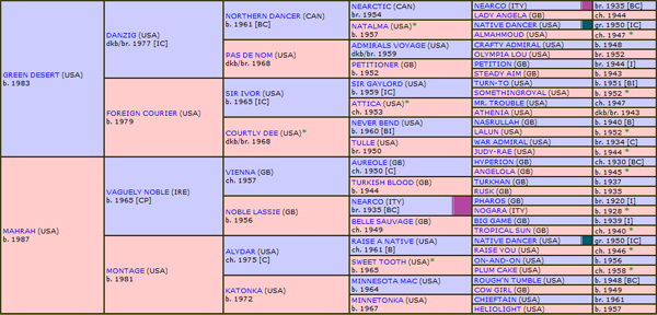 • (HL) – GREEN DESERT – PHALARIS / NORTHERN DANCER • (ML) – VAGUELY NOBLE – HYPERION / AUREOLE • Alcance Estamínico: 2 000 m, pista de grama. • Configuração Genética Básica: • a – Por Linhagem de Referência: PHALARIS com HYPERION; • b – Por “Bloodline”: NORTHERN DANCER com AUREOLE. • Duplicações: 5 X 4 NEARCO – PHALARIS; 5 X 5 NATIVE DANCER. • Família Materna: 9 – c. • Matrizes servidas em 2009: 23 • Reprodutor sediado no Haras São Luiz Gonzaga, São José dos Pinhais, PR.