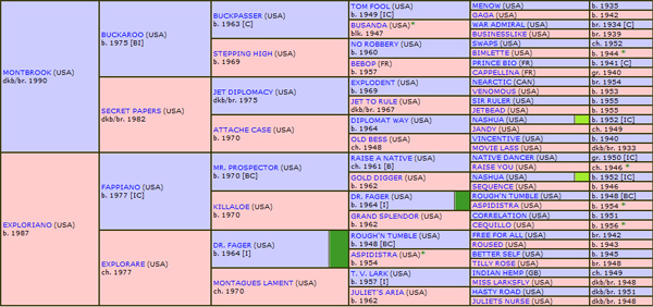 • (HL) – MONTBROOK – PHALARIS / BUCKPASSER • (ML) – FAPPIANO – NATIVE DANCER / Mr. PROSPECTOR • Alcance Estamínico: 1 400 m, pista de areia, preferencialmente. • Configuração Genética Básica: • a – Por Linhagem de Referência: PHALARIS com NATIVE DANCER; • b – Por “Bloodline”: BUCKPASSER com Mr. PROSPECTOR. • Duplicações: 5 X 5 NASHUA – PHALARIS / NASRULLAH • Família Materna: 23 – b. • Matrizes servidas em 2009: 80 • Reprodutor sediado no Haras Santarém, São José dos Pinhais, Paraná.