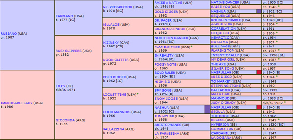 • (HL) – RUBIANO – NATIVE DANCER / Mr. PROSPECTOR • (ML) – LILOY – PHALARIS / NASRULLAH • Alcance Estamínico: 1 600 m a 2 000 m, pista de areia. • Configuração Genética Básica: • a – Por Linhagem de Referência: NATIVE DANCER com PHALARIS; • b – Por “Bloodline”: Mr. PROSPECTOR com NASRULLAH. • Duplicações: 5 X 4 NASHUA – PHALARIS / NASRULLAH • Família Materna: 3 – b. • Matrizes servidas em 2009: 26 • Reprodutor sediado no Haras Santarém, São José dos Pinhais, Paraná.
