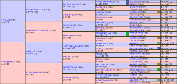 • (HL) – MISWAKI – NATIVE DANCER / Mr. PROSPECTOR • (ML) – NUREYEV – PHALARIS / NORTHERN DANCER • Alcance Estamínico: 1 800 m, pista de grama. • Configuração Genética Básica: • a – Por Linhagem de Referência: NATIVE DANCER com PHALARIS; • b – Por “Bloodline”: Mr. PROSPECTOR com NORTHERN DANCER. • Duplicações: 4 X 5 NATIVE DANCER; 5 X 5 X 5 NASRULLAH – PHALARIS; 4 X 5 (XF) PRINCEQUILLO – St. SIMON. • Família Materna: 14 – c. • Matrizes servidas em 2009: 28 • Reprodutor sediado no Haras J. B. Barros, São José dos Pinhais, Paraná.