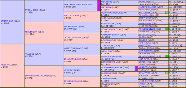 • (HL) – STORM CAT – PHALARIS / NORTHERN DANCER • (ML) – ALLEGED – St. SIMON / RIBOT • Alcance Estamínico: Entre 1 300 m e 1 600 m, pista de areia. • Configuração Genética Básica: • a – Por Linhagem de Referência: PHALARIS com St. SIMON; • b – Por “Bloodline”: NORTHERN DANCER com RIBOT. • Duplicações: 3 X 4 NORTHERN DANCER – PHALARIS; 5 X 5 BULL PAGE – TEDDY / BULL DOG; 5 X 5 (XF) PRINCEQUILLO – St. SIMON. • Família Materna: 4 – r. • Matrizes servidas em 2009: 36 • Reprodutor sediado no Paraná.