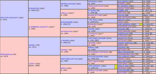 • (HL) – PRIVATE ACCOUNT – TEDDY / DAMASCUS • (ML) – PHARLY – PHALARIS / NORTHERN DANCER • Alcance Estamínico: 2 000 m, pista de grama • Configuração Genética Básica: • a – Por Linhagem de Referência: YEDDY com PHALARIS; • b – Por “Bloodline”: DAMASCUS com NORTHERN DANCER. • Duplicações: 5 X 4 (XF) WAR ADMIRAL – MAN O’ WAR • Família Materna: 1 – x. • Matrizes servidas em 2009: 70 • Reprodutor sediado no Haras Bagé do Sul, Bagé, Rio Grande do Sul.