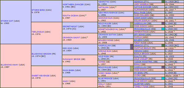 • (HL) – STORM CAT – PHALARIS / NORTHERN DANCER • (ML) – BLUSHING GROOM – PHALARIS / NASRULLAH • Alcance Estamínico: 1 200 m a 1 400 m, pista de areia. • Configuração Genética Básica: • a – Por Linhagem de Referência: PHALARIS com PHALARIS; • b – Por “Bloodline”: NORTHERN DANCER com NASRULLAH. • Duplicações: 4 X 4 BOLD RULER – PHALARIS / NASRULLAH; 5 X 5 NEARCO – PHALARIS; 5 X 5 (XF) – PRINCEQUILLO – St. SIMON; 5 X 4 X 5 NASRULLAH – PHALARIS. • Família Materna: 1 – n. • Matrizes servidas em 2009: 62 • Reprodutor sediado no Paraná.