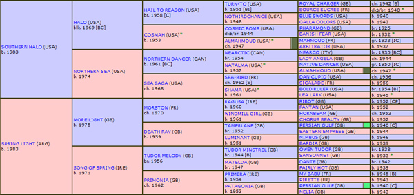 • (HL) – SOUTHERN HALO – PHALARIS / ROYAL CHARGER • (ML) – MORE LIGHT – St. SIMON / RIBOT • Alcance Estamínico: 1 700 m, pista de areia. • Configuração Genética Clássica: • a – Por Linhagem de Referência: PHALARIS com St. SIMON; • b – Por “Bloodline”: ROYAL CHARGER com RIBOT. • Duplicações: “Outcross” Absoluto de 5ª Geração. • Família Materna: 20 – c. • Matrizes servidas em 2009: 31 • Reprodutor sediado no Haras Campestre, Rio Grande do Sul.