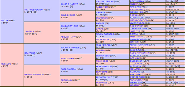 • (HL) – GULCH – NATIVE DANCER / Mr. PROSPECTOR • (ML) – Dr. FAGER – HIMYAR / ROUGH’N TUMBLE • Alcance Estamínico: 1 800 m, pista de grama / areia. • Configuração Genética Básica: • a – Por Linhagem de Referência: NATIVE DANCER com HIMYAR; • b – Por “Bloodline”: Mr. PROSPECTOR com ROUGH’N TUMBLE. • Duplicações: “Outcross” Absoluto de 5ª Geração. • Família Materna: 16 – a. • Matrizes servidas em 2009: 19 • Reprodutor sediado no Haras Santa Rita da Serra, Tijucas do Sul, Paraná.