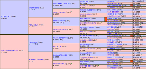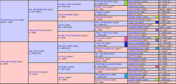 • (HL) – MACHIAVELLIAN – NATIVE DANCER / Mr. PROSPECTOR • (ML) – SIR IVOR – PHALARIS / ROYAL CHARGER • Alcance Estamínico: 1 600 m, pista de grama. • Configuração Genética Básica: • a – Por Linhagem de Referência: NATIVE DANCER com PHALARIS; • b – Por “Bloodline”: Mr. PROSPECTOR com ROYAL CHARGER. • Duplicações: 5 x 5 COUNT FLEET – SUNDRIDGE; 5 X 4 TURN–TO – PHALARIS / ROYAL CHARGER; 4 X 5 (RF) NATALMA – NATIVE DANCER. • Família Materna: 5 – g. • Matrizes servidas em 2009: 62 • Reprodutor sediado no Stud TNT, Bagé, Rio Grande do Sul.