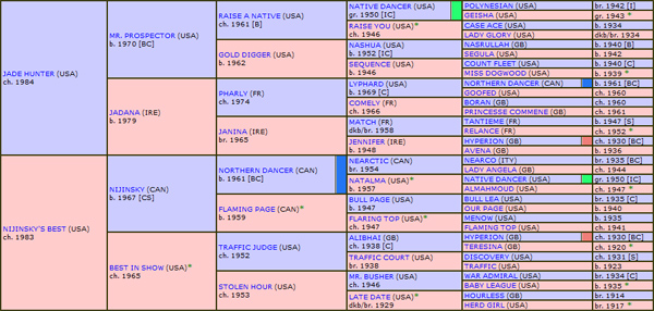 • (HL) – JADE HUNTER – NATIVE DANCER / Mr. PROSPECTOR • (ML) – NIJNSKY – PHALARIS / NORTHERN DANCER • Alcance Estamínico: 1 800 m a 2 000 m, pista de grama. • Configuração Genética Básica: • a – Por Linhagem de Referência: NATIVE DANCER com PHALARIS; • b – Por “Bloodlines”: Mr. PROSPECTOR com NORTHERN DANCER. • Duplicações: 4 X 5 NATIVE DANCER; 5 X 3 NORTHERN DANCER – PHALARIS; 5 X 5 HYPERION. • Família Materna: 8 – f. • Matrizes servidas em 2009: 18 • Reprodutor sediado no Haras Interlagos, São Paulo.