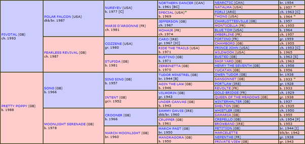 – Genótipo: Por sua “high line” (HL), seu Pai, PIVOTAL, descende da “Bloodline” de NORTHERN DANCER, através do Alinhamento de NUREYEV, enquanto, por sua “middle line” (ML), seu Avô Materno, SONG, foi um emérito “sprinter”, descendente da “Bloodline” de TUDOR MINSTREL, Linhagem de HYPERION. Seu Genótipo exibe um Cenário Genético tendendo para o regime de “Outcross”, evidenciando uma única duplicação, na modalidade do “linebreeding” (5 X 6) no vencedor do Derby de Epsom, CREPELLO, da Linhagem de BLANDFORD.
