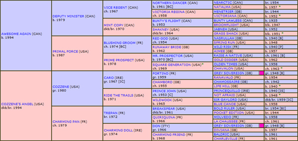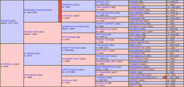 – Genótipo: Por sua “high line” (HL), seu Pai, DANZIG, descende da “Bloodline” de NORTHERN DANCER, enquanto, por sua “middle line” (ML), seu Avô Materno, ALLEGED, um dos raros vencedores do GP Arco do Triunfo, por duas vezes, descende da “Bloodline” de RIBOT, da Linhagem do fenomenal Reprodutor do século 19 / 20, St. SIMON. Seu Pedigree de 6ª Geração exibe um Genótipo pontuado pela inusitada duplicação (2 X 5) no excepcional Reprodutor, NORTHERN DANCER e uma qualificada tripla participação (6 X 5 X 6), nas condições do “X Factor” (XF), em WAR ADMIRAL, um dos quatro ícones na transmissão do cromossomo X, responsável pelo “coração de grande porte”.