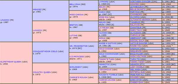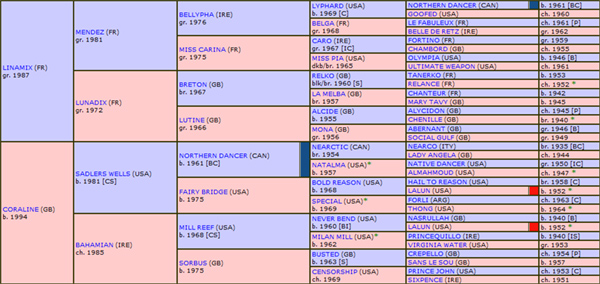 – Genótipo: Por sua “high line” (HL), seu Pai, LINAMIX, descende da “Bloodline” de NORTHERN DANCER, através do Alinhamento pontuado por LYPHARD, enquanto, por sua “middle line” (ML), seu Avô Materno, SADLER’S WELLS, também descende da “Bloodline” de NORTHERN DANCER. Seu Genótipo exibe duplicações em NORTHERN DANCER (5 X 4) e em DONATELLO II (6 X 6), fator provável como responsável por sua qualificação como muito bom Fundista.