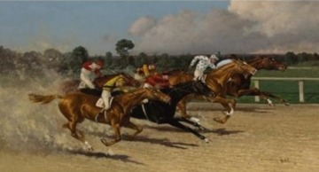 Nearing the finish – Quadro de Henry Stull – 1909 – Óleo sobre Tela – 111.7x60.9cm | 1°: 5-6-1 Capi Capi (5) vem correndo claimings misturados mais fortes e tem leve destaque na abertura do programa. Quelance (6) que vem de vencer potranca boa no quilômetro fica para a dupla. Nightwish (1) depois.