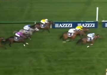 A primeira vitória de Olimac na Gávea, em 11.02.2025, montaria de W. Bland, treinamento de M. Aurélio, com a farda do Stud Kategoria.