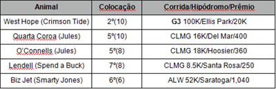 1º WE GOT DA FEVA – alazão castrado, 6 anos, Soft Gold–Star Stepping (Moscow Ballet). Cr: Russel & Shirley Girvin (California)/ Prop: A Double Monkey Stable/ Tr: M.Flores. Jóquei: Saul Duarte. RR: 50–11–5–12, $ 61,548, 3º Rillito Park Budweiser Mile Handicap (1700mA). 2º Born a Legend, 1/2 corpo; 3º Ferndale Sal, 4 corpos. Correram 7.