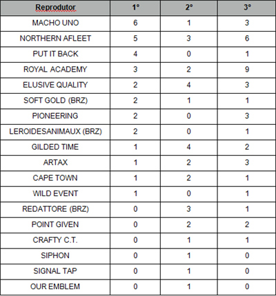 Resultado por reprodutor descritos abaixo: 1º – qualquer nível; 2º e 3º, apenas em MSW, Allowance, AOC, Handicaps, Stakes. Porém todos os resultados, inclusive claimings e maiden claimings, até 3º, estão representados na tabela.