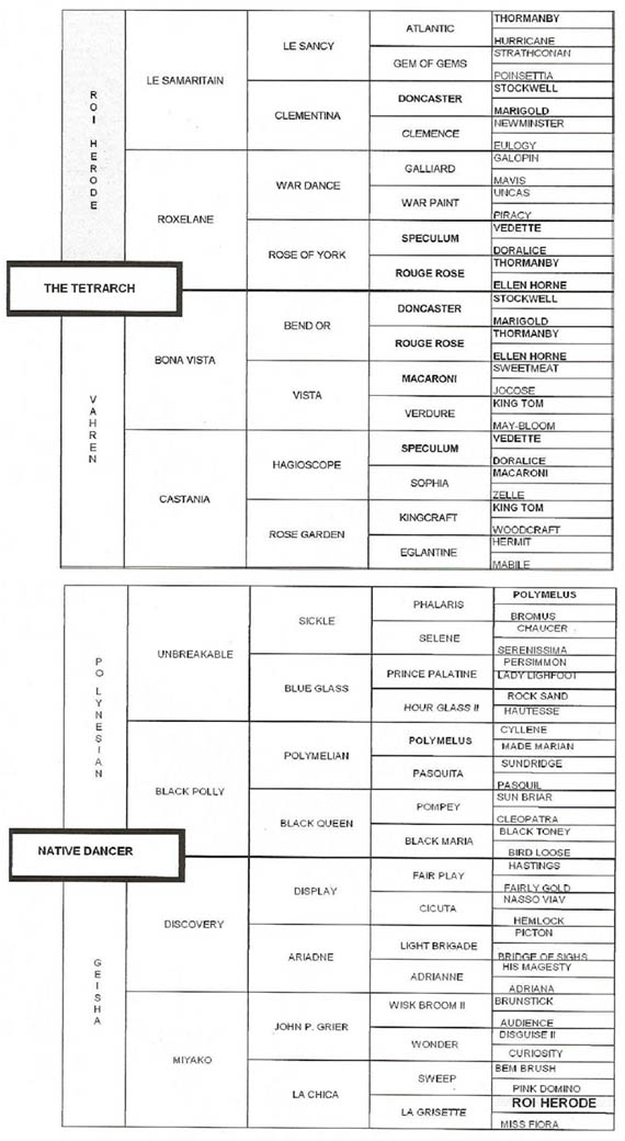 Como uma imagem vale mais do que mil palavras, a seguir encontramos os Pedigrees de THE TETRARCH e NATIVE DANCER, para verificar a participação de ROI HERODE no Genótipo de ambos.