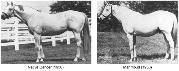 Com a mesma finalidade, exibimos as fotos do ancestral de origem dos tordilhos PSI (ALCOCK ARABIAN), do Puro Sangue Árabe Branco, Asil (FEDAAN), de ROI HERODE (o ancestral comum aos dois protagonistas deste Artigo), de THE TETRARCH e NATIVE DANCER (protagonistas deste Artigo) e de MAHMOUD (cuja 2ª Mãe foi MUMTAZ MAHAL, filha de THE TETRARCH), onde poderá ser constatada a semelhança de seus Fenótipos, sendo todos eles tordilhos.