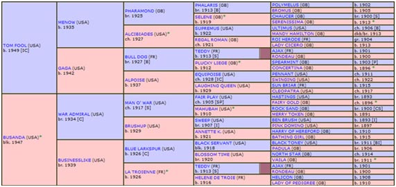 • TOM FOOL, seu Pai, descende do Alinhamento Masculino Paterno pontuado pelo excelente Reprodutor PHARAMOND, filho de uma das mais extraordinárias Matrizes do Turfe mundial, SELENE, portanto, irmão materno do excepcional Reprodutor HYPERION, além de proporcionar o importante “inbreeding” em TEDDY.