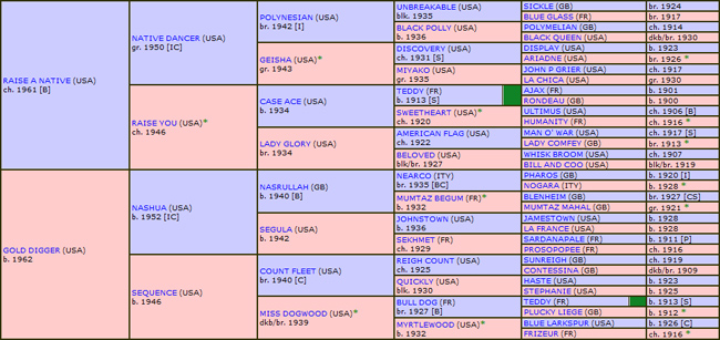 III.1 – Mr. PROSPECTOR – USA – 1970 – M.C. – RAISE A NATIVE (por NATIVE DANCER) X GOLD DIGGER por NASHUA X SEQUENCE por COUNT FLEET.
