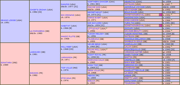 – Genótipo: Por sua “high line” (HL), seu Pai, GRAND LODGE, descende da “Bloodline” de NORTHERN DANCER, através do extraordinário Alinhamento de DANZIG, enquanto, por sua “middle line” (ML), seu Avô Materno, LASHKARI, descende da “Bloodline” de NASRULLAH, através do notável NEVER BEND e seu prodigioso filho, MILL REEF. Seu Pedigree de 5ª Geração exibe um Genótipo caracterizado pelo regime de “Outcross”, enquanto seu Pedigree de 6ª Geração exibe duplicações, em “linebreeding”, em três notáveis Reprodutores do século 20, NEARCO, seu filho, NASRULLAH e OWEN TUDOR, o grande responsável pela continuidade da Linhagem de HYPERION, até os dias atuais. Mas o destaque de seu Genótipo, no Pedigree de 6ª Geração, fica por conta da tripla participação do extraordinário PRINCEQUILLO, nas condições do “X Factor” (XF), do qual é considerado como um de seus 4 ícones.