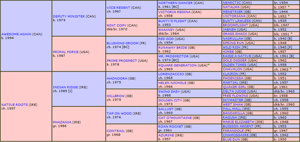 – Genótipo: Por sua “high line” (HL), seu Pai, AWESOME AGAIN, descende da “Bloodline” de NORTHERN DANCER, através do Alinhamento de DEPUTY MINISTER, enquanto, por sua “middle line’, seu Avô Materno, INDIAN RIDGE, Chefe de Raça, descende da “Linhagem de TOURBILLON, através da “Bloodline” de AHONOORA. Seu Pedigree de 5ª Geração exibe um Cenário Genético de “Outcross” absoluto, enquanto, por seu Pedigree de 6ª Geração exibe duplicações no excelente “sprinter”, POLYNESIAN, e no consistente e resistente, RELIC, ambos na verticalidade de sua 6ª Geração.