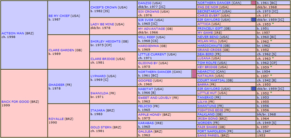 Sua “bottom line “ (BL) se reporta à Família Materna 1 – e, através de Ramal desenvolvido no Brasil pelo fundamental Haras São José & Expedictus, mas pontuada pela excepcional Matriz, MALVA (8ª Mãe de BELO ACTEON), simplesmente, a Mãe de dois excelentes “racehorses” e extraordinários Rerodutores e Avôs Maternos da Criação mundial do PSI, ou seja, BLENHEIM, um dos dois responsáveis pela perpetuação da Linhagem de BLANDFORD (DANCER MAN) até hoje, e do nosso conhecido KING SALMON, neto paterno do fenomenal THE TETRARCH, que foi o “runner up” (2º colocado) para HYPERION no Derby de Epsom de 1933, atuando como extraordinário Reprodutor na Europa e, sobretudo, no Brasil, onde veio a se tornar um de seus mais importantes Avôs Maternos.