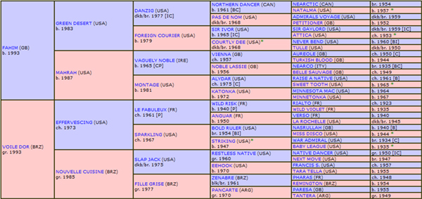 • Genótipo: Estabelece o encontro da “Bloodline” do fabuloso NORTHERN DANCER, através do Alinhamento do extraordinário raçador DANZIG, com a Linhagem de St. SIMON, através da consistente “Bloodline” de WILD RISK, também extraordinário raçador da Criação mundial do PSI, representada pelo Alinhamento de LE FABULEUX fiel continuador das virtudes desta Linhagem e “Bloodline”, cuja característica maior é a de proporcionar os melhores Avôs Maternos do Turfe internacional e nacional, o que pode ser confirmado pela breve e destacada atuação de EFFERVESCING, Avô Materno de PERICHOLE, em nossa Criação.