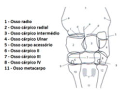 Sete ossos compões esta articulação, o osso carpo acessório, osso cárpico ulnar, osso cárpico intermédio, osso cárpico radial, osso cárpico IV, osso cárpico III e osso cárpico II (figura II).