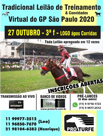 Última semana de inscrições para o Tradicional LEILÃO Virtual de Treinamento do GP São Paulo da PRO TURFE; que será realizado no dia 27 de outubro, terça–feira–feira, daqui há duas semanas.
