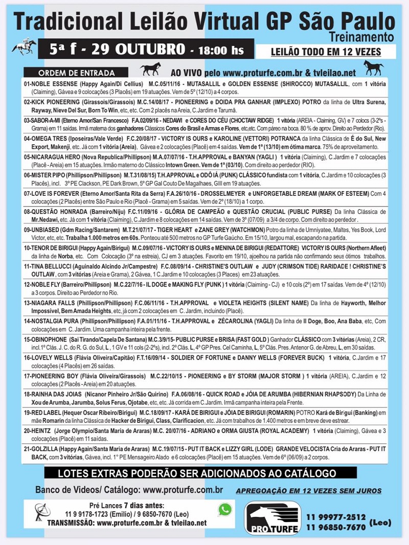 LEILÃO Virtual de Treinamento GP São Paulo da PRO TURFE – 29/10 às 18h