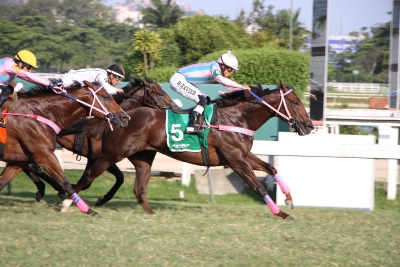 Lord Gold, um filho de Agnes Gold e Carol’s Street, por Street Cry, de criação do Haras Anderson, e propriedade do Haras Sweet Carol, bem conduzido por Wilkley Xavier, e apresentado no auge do estado atlético por Adélcio Menegolo, surpreendeu os mais cotados, alcançou um deles, Justiceiro Colt, do Stud 5 Amigos, em cima do disco, e conquistou o Grande Prêmio Adhemar e Roberto Gabizo de Faria, Grupo 3, corrido há pouco na Gávea, na distância de 1000 metros, na grama, em 55s17. Justiceiro Colt manteve a dupla, ameaçado por Jonnos, companheiro de farda do ganhador, que finalizou no terceiro posto. Lindsay Lohan, do Haras Santa Maria de Araras, completou o placar da competição, em ótima atuação.