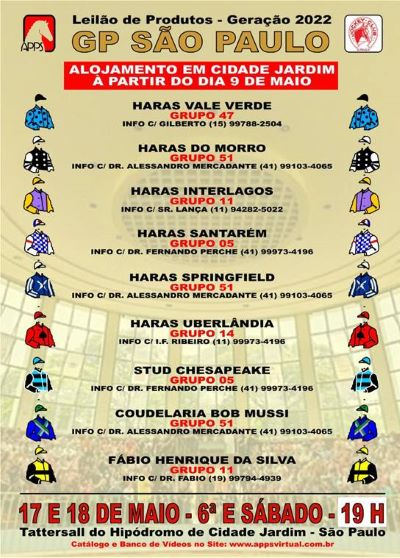 Nos dias 17 e 18 DE MAIO, sexta e sábado do GP São Paulo, a partir das 19 horas, acontecerá de forma presencial, no Tattersall do jockey Club de São Paulo, o leilão que distribui um BÔNUS de R$ 10.000 para os produtos adquiridos neste leilão, que ganharem aos 2 anos em Cidade Jardim (regulamento próprio).