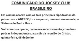 Hoje, o Jockey Club Brasileiro comunicou que de comum acordo com os Jockeys de São Paulo, Paraná, Rio Grande do Sul e a ABCPCC, a suspensão momentânea do Sistema Pedra Única.