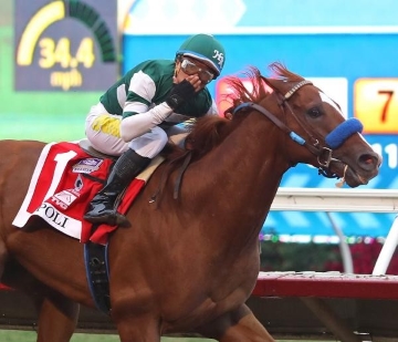 T.J. Pereira vencendo o Pacific Classic Stakes (G1) em 2021, com o craque Tripoli em Del Mar