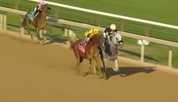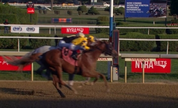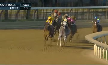 Na curva final, até porque a reta de Saratoga é curta, No Bien Ni Mal foi ganhando posição e passando para segundo. O tordilho Hop Sing era o ponteiro, com Mikealicious (boné rosa) corria em terceiro e Pandagate com Dylan Davis, melhorando para quarto.