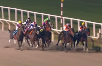 Na entrada da reta, o brasileiro Labor Day junto a cerca está na ponta, ao seu lado Jeronimo vai em segundo, Man of Word em terceiro, L’Intrigatore (boné vermelho e branco) vai quarto,