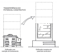 Esquema mostrando o princípio da transferência do potencial construtivo. O terreno de um imóvel tombado, que teria direito a construir neste terreno X m², e não pode construir por ser tombado, tem direito a “vender” os m² excedentes para um outro empreendimento em áreas designadas pela prefeitura. Desenho de Bárbara Lopes
