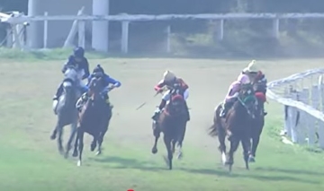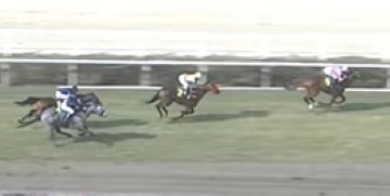 Na entrada da reta, Indiana Star na ponta, Terteboro em segundo por fora de Indiana Star, Jogo mais por fora ainda em terceiro, Gibraltar Channel em quarto junto a cerca e o tordilho Terapeuta em quinto.