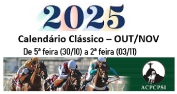30/10 – 5ª feira Cristal – Clássico Presidente José I. Cunha Rasgado – 1.380 metros – areia – Produtos de 3 anos e mais idade, sem vitória Clássica. Club Hípico Chile – 31/10 – Clásico El Ensayo Mega Gr 1 NOVEMBRO 01/11 – Sábado Cidade Jardim – Handicap Especial Immensity – 2.400 metros – grama – Éguas de 3 e mais anos San Isidro – GP Copa de Oro – Gr 1 – 2400 m San Isidro – GP Enrique Acebal Gr 1 – 2000 m San Isidro – GP De La Provincia de Buenos Aires G3 – 2400 m Maroñas – Handicap Especial Sir Fever – 1.200 metros – Areia Maroñas – Clásico Amodeo – 1.000 metros – areia Maroñas – Handicap Especial Miguel y Juan Debernardis – 2.00 metros – grama Maroñas – Clássico Marcelo, Mauricio y Andres Wildemauwe – 1.000 metros – Areia – Potrancas 3 anos Hipódromo Chile – GP Alberto Solari – Gr 1 – 2.000 metros – Potrancas 3 anos 02/11 – Domingo Gávea – Clássico Much Better (L) – 1.900m (areia) – produtos de três anos e mais idade.