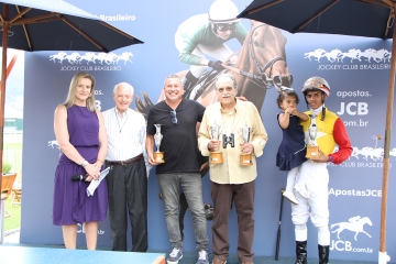 No pódio recebendo o troféu, o titular do Stud São Francisco da Serra, o jóquei W. Xavier com sua filha, o treinador J. C. Sampaio e representantes do JCB