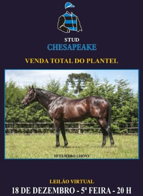 Com o triste e recente falecimento de José Luiz Rego Glaser, Titular do Stud Chesapeak, seus familiares decidiram não continuar na atividade, tomando a decisão de ofertar a totalidade do plantel, inclusive cotas de reprodutores.