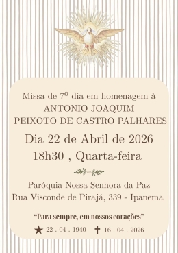 A família Peixoto de Castro Palhares, informa que a missa de sétimo dia será 22/04/2026, nesta próxima quarta–feira, às 18:30h, na Paróquia Nossa Senhora da Paz, na Rua Visconde de Pirajá, 339 – Ipanema, Rio de Janeiro.