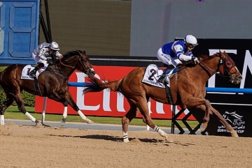 Ombudsman, com as cores azuis da Godolphin, e treinamento de John Gosden, vencendo o Dubai Turf, G1 da 30ª edição da Dubai World Cup