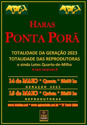 Criador de impressionantes 611 ganhadores de pencas, e cujas matrizes apenas em 2025 em outros criatórios geraram mais 9 campeões na cancha reta (entre eles o do GP Turfe Gaúcho, a maior penca do Brasil), além do campeão de G1 e recordista dos 1000m na Gávea Eletrizante Dollar, o tradicional Haras Ponta Porã oferecerá ao mercado nas noites de 4ª e 5ª desta semana a totalidade de sua geração 2023, e a totalidade de suas matrizes.