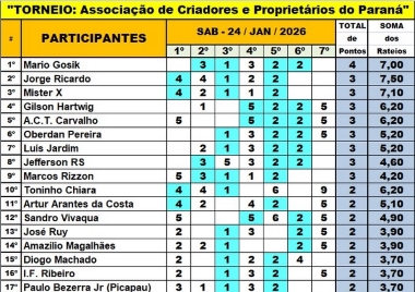 No disputado Torneio pelo Canal AoLéu no You Tube, com apoio do RAIALEVE, neste sábado 24/1 em Curitiba, com 34 estudiosos, e com 80 % de acertos, a vitória sorriu para Mário Gosik, por pequena diferença ao campeão nas pistas Jorge Ricardo.