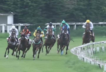 A entrada da reta, com New Tapit (boné verde e manga amarela) na ponta, Hello Afleet em segundo ao seu lado e La Ilusión (de branco) por fora de todas em terceiro.